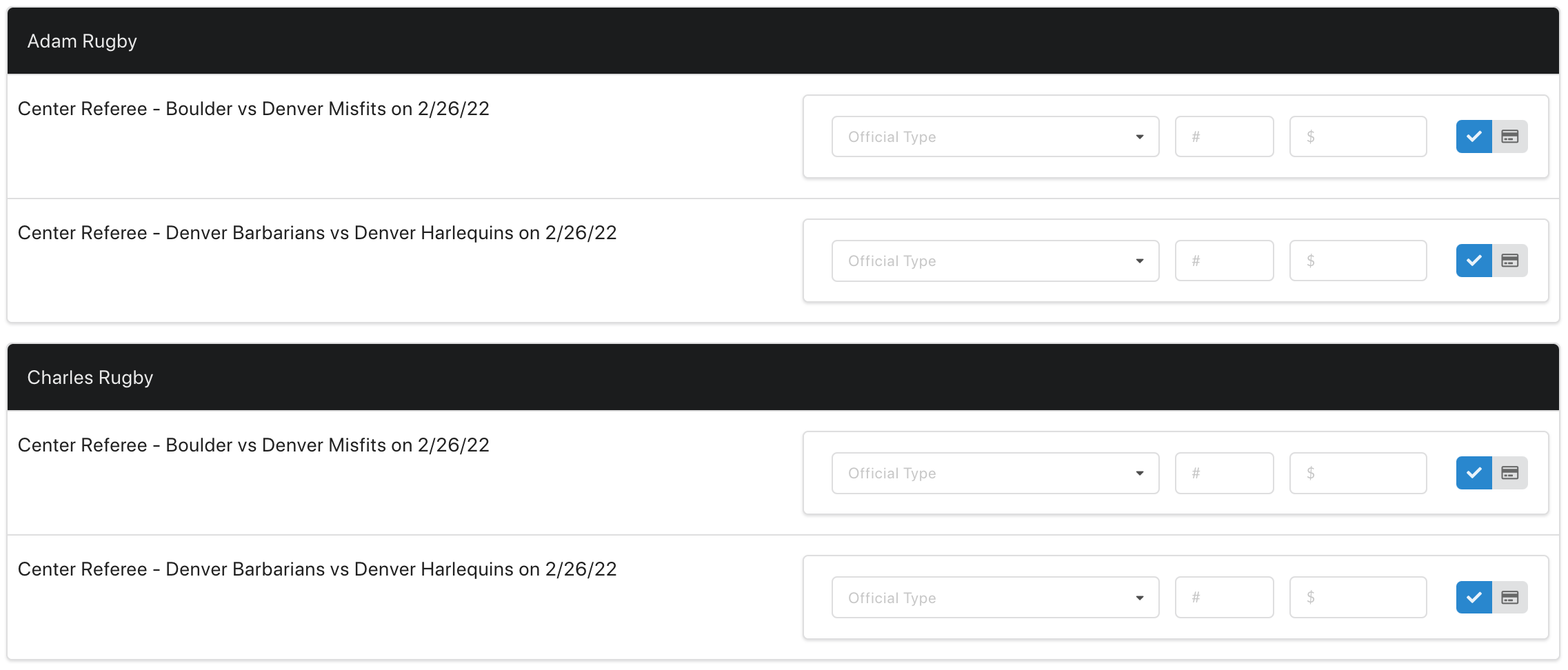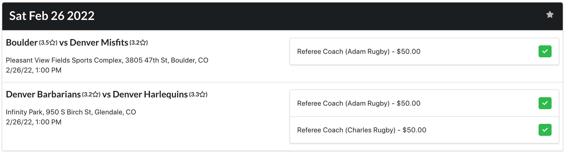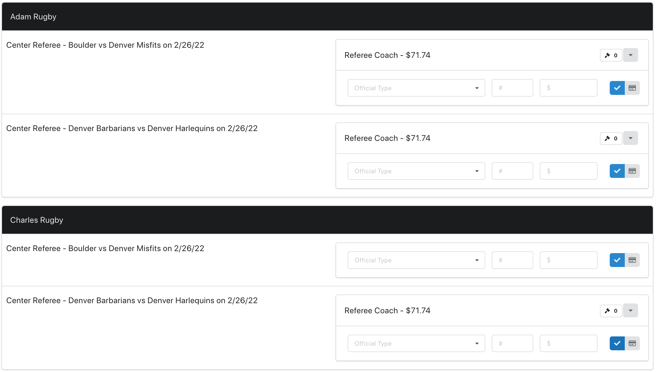 - Both Adam Rugby and Charles Rugby have created offers for the center referee bids for the Boulder and Barbarians matches: