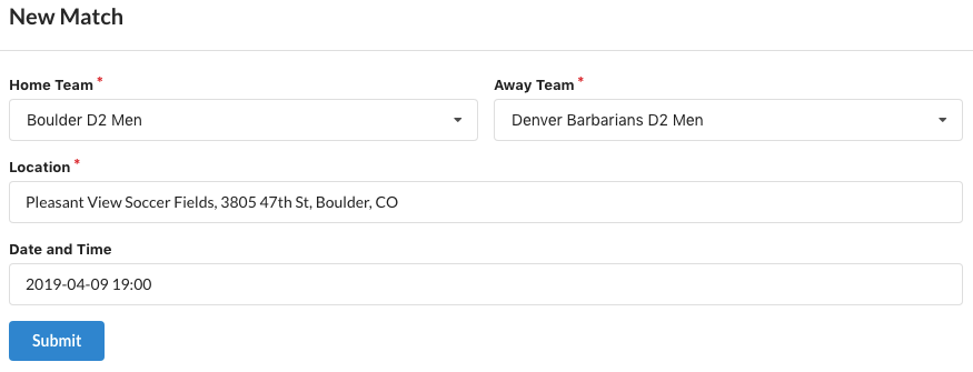 at the top of the screen to create a new match. Enter the match details and click Submit